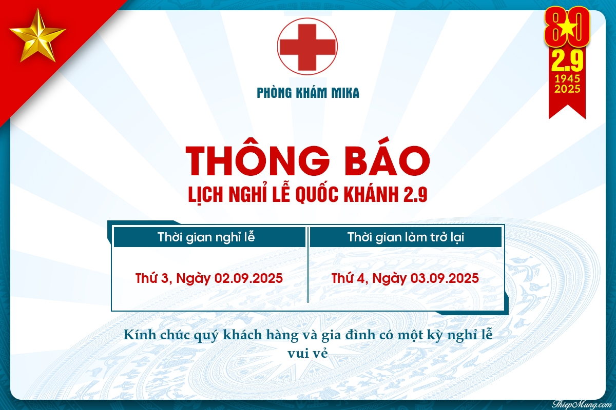 PK Mika trân trọng thông báo lịch nghỉ quốc khánh 02/09/2025 Phòng khám nghỉ (01) ngày 02/09/2025 Làm việc trở lại vào thứ 4 , ngày 03/09/2025 Kính chúc quý khách hàng và gia đình có một kỳ nghỉ lễ vui vẻ...