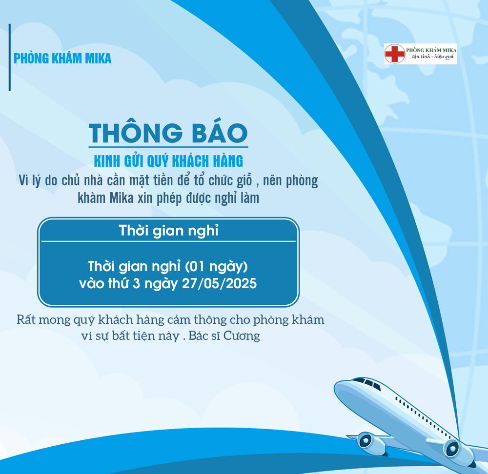 Vì lý do chủ nhà cần mặt tiền để tổ chức giỗ, nên phòng khám Mika xin phép được nghỉ làm 01 ngày thứ 3 (27/05/2025)